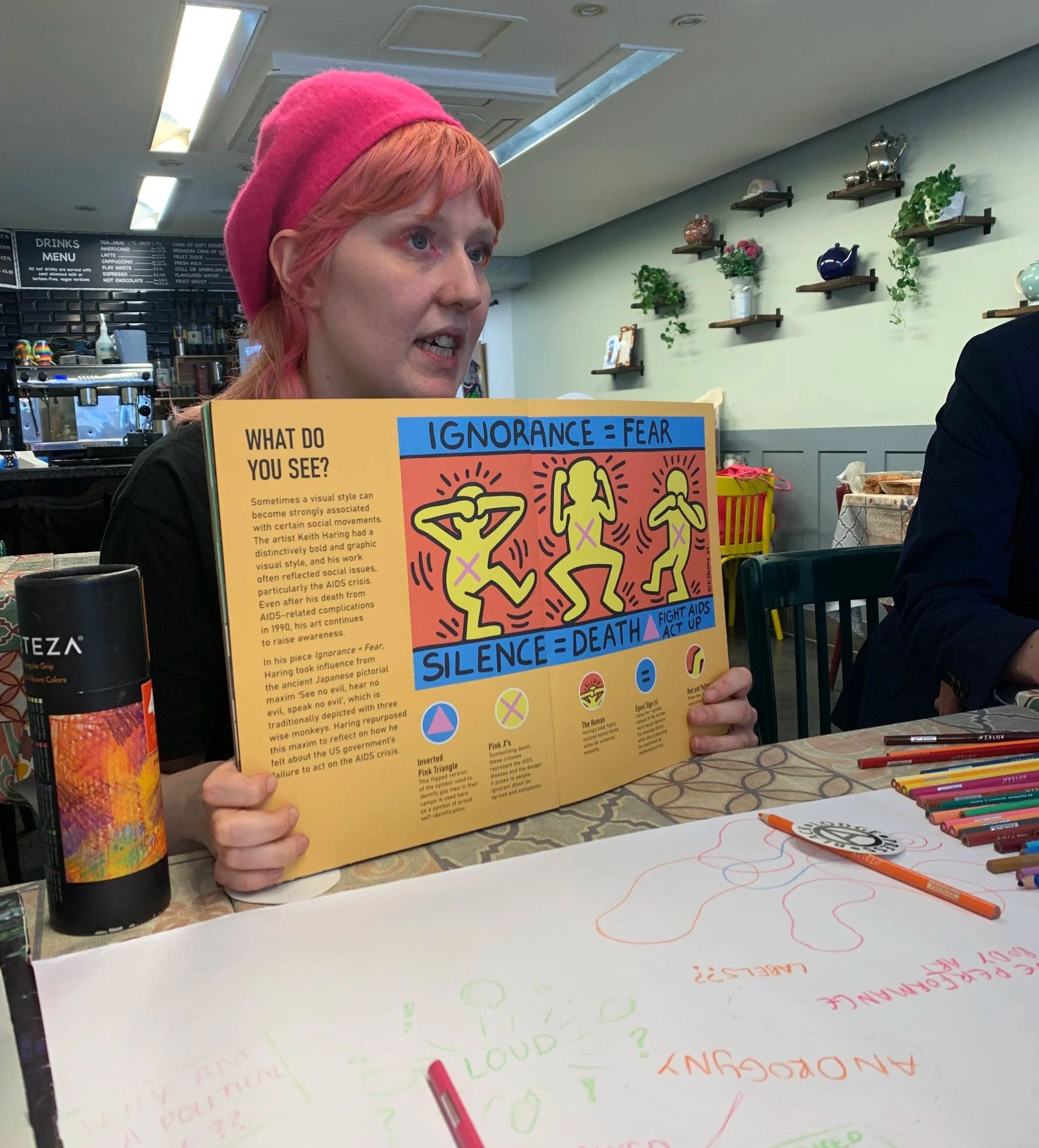 Participants explored the work of influential queer artists including Keith Haring and Gluck, discussing how artists have used visual culture to express identity, protest injustice, and build community.